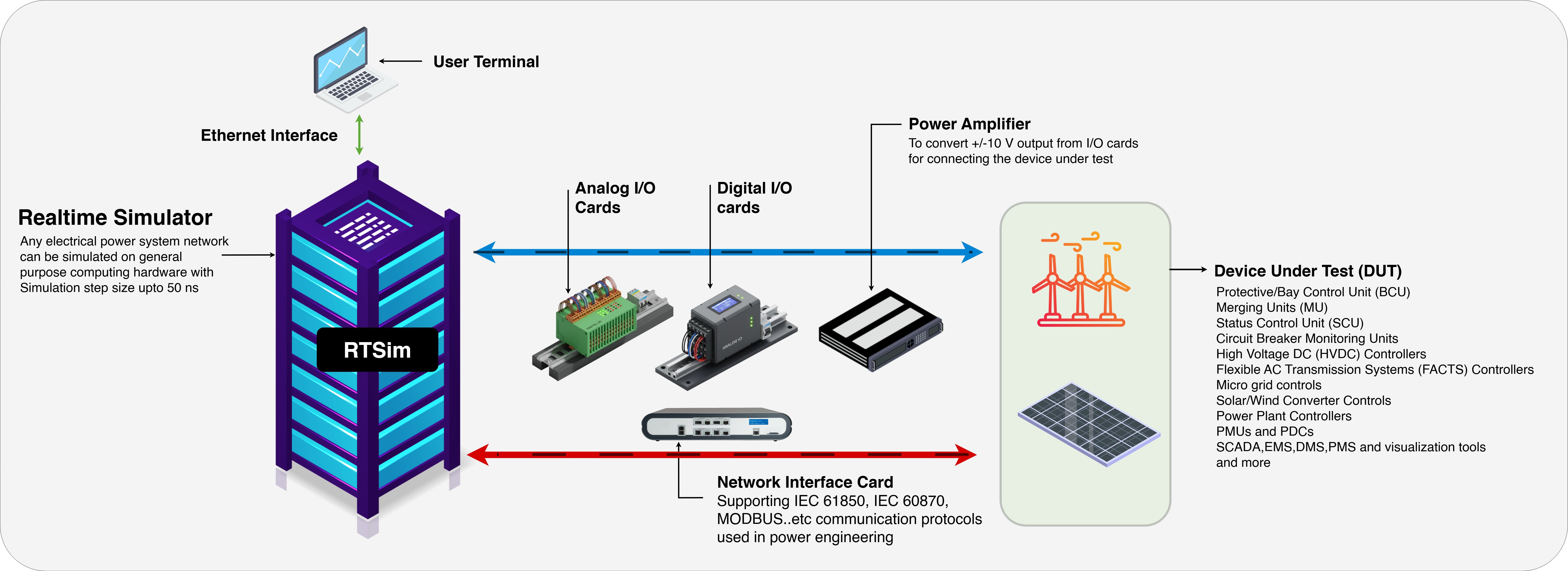 - Support for Modbus, CAN, IEC 61850, DNP3, and proprietary Ethernet protocols ensures real-time data exchange between RTSim and controller.